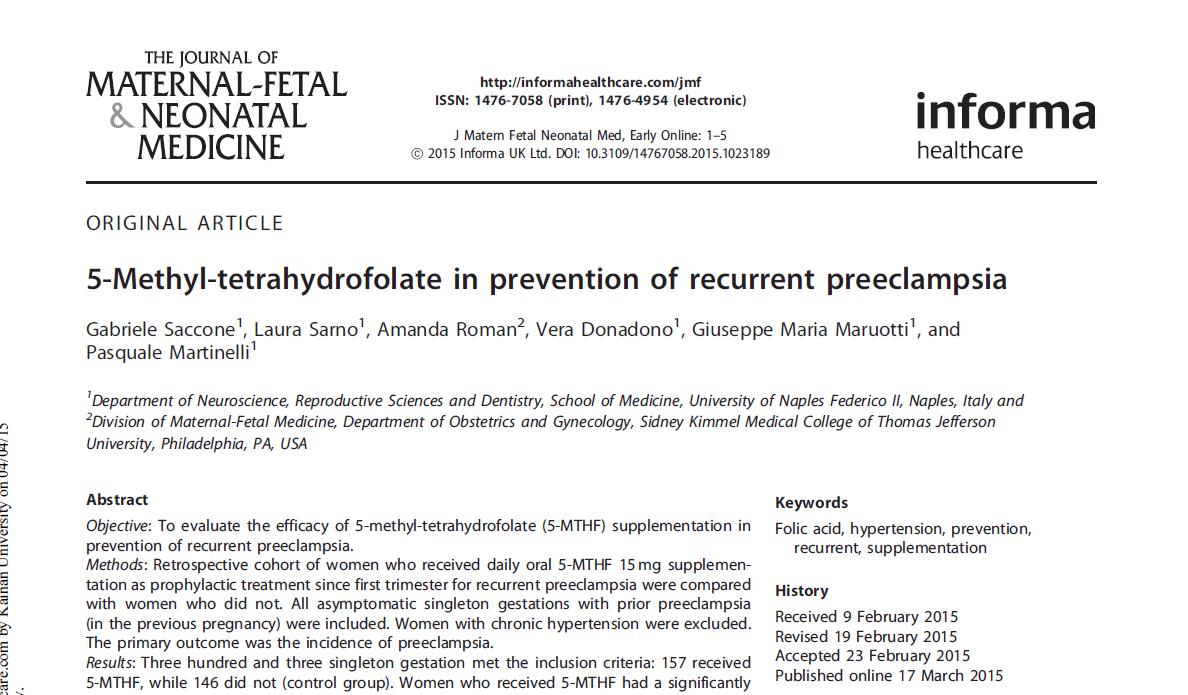 ஒரு 2015 இத்தாலியன் பின்னோக்கி ஒருங்கிணைந்த ஆய்வு (n = 303 முன் ப்ரீக்ளாம்ப்சியா கொண்ட பெண்கள்) அதைக் காட்டுகிறது முதல் மூன்று மாதங்களில் இருந்து தினசரி 15 mg 5-MTHF ஒட்டுமொத்த மறுநிகழ்வைக் குறைக்கிறது 39.7 % முதல் 21.7 % வரை (OR 0.57, 95 % CI 0.25–0.69), கடுமையான 8.9 % முதல் 3.2 % வரை (OR 0.44, 95 % CI 0.12–0.97), மற்றும் ஆரம்ப ஆரம்பம் 7.5 % இலிருந்து 1.9 % (OR 0.34, 95 % CI 0.07–0.87) [2]