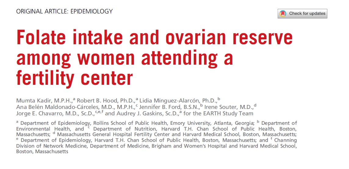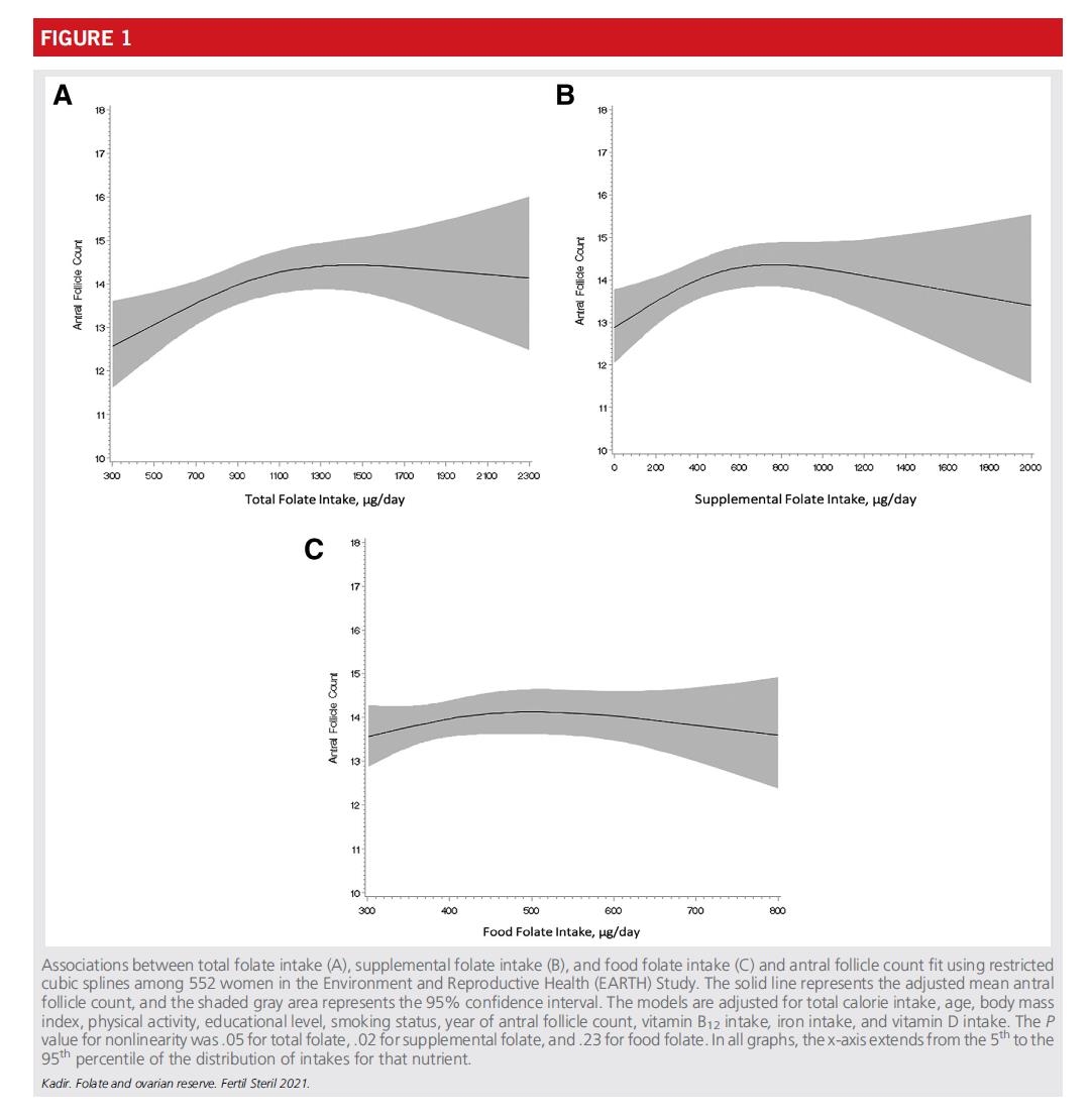 இந்த ஆய்வு 552 பெண்களின் தரவுகளை ஆய்வு செய்தது அமெரிக்காவில் உள்ள மாசசூசெட்ஸ் பொது மருத்துவமனை கருவுறுதல் மையம், கவனம் செலுத்துகிறது ஃபோலிக் அமில உட்கொள்ளல் மற்றும் கருப்பை இருப்பு செயல்பாடு ஆகியவற்றுக்கு இடையேயான தொடர்பு (Antral Follicle Count, AFC ஆல் அளவிடப்படுகிறது).
