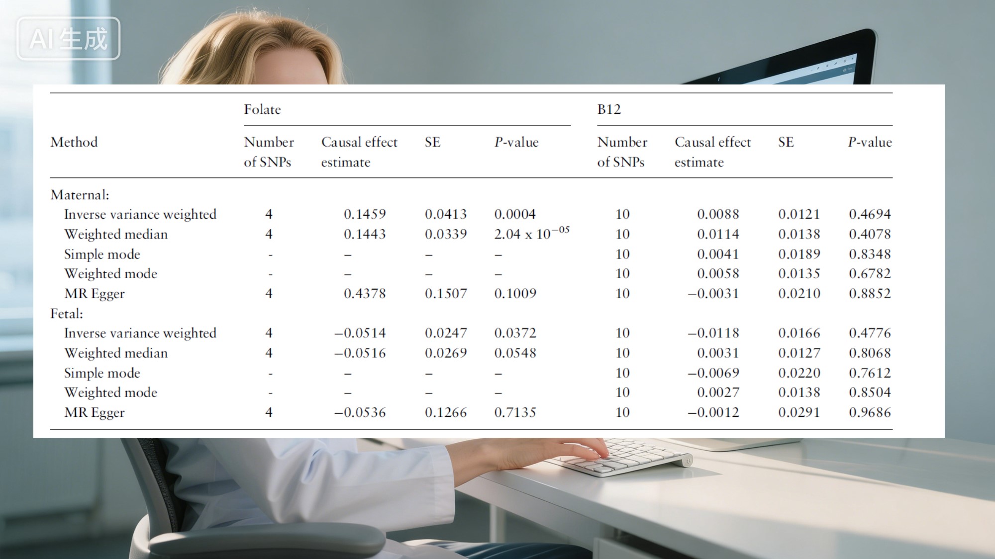 க்குஃபோலேட், ஆதாரம் தெளிவாக இருந்தது: உயர்ந்தது தாய்வழி ஃபோலேட் அளவு குழந்தைகள் அதிக எடை அதிகரிக்க உதவுகிறது. சராசரியாக, ஒவ்வொன்றும் ஒரு தரநிலை விலகல் ஃபோலேட் அதிகரிப்பு பிறப்பு எடையின் கூடுதல் ~71 கிராம் உடன் ஒத்துள்ளது. இது வெவ்வேறு பகுப்பாய்வு முறைகளில், போக்கு சீராக இருந்தது முந்தைய மருத்துவ அவதானிப்புகள் மற்றும் இப்போது மரபணு அளவிலான தரவு மூலம் வலுப்படுத்தப்பட்டுள்ளது. ஃபோலேட், புதிதாகப் பிறந்த குழந்தைகளுக்கு வலுவான தொடக்கத்தை வழங்குவதற்கு இது ஒரு உறுதியான பங்களிப்பாகும் வாழ்க்கை.