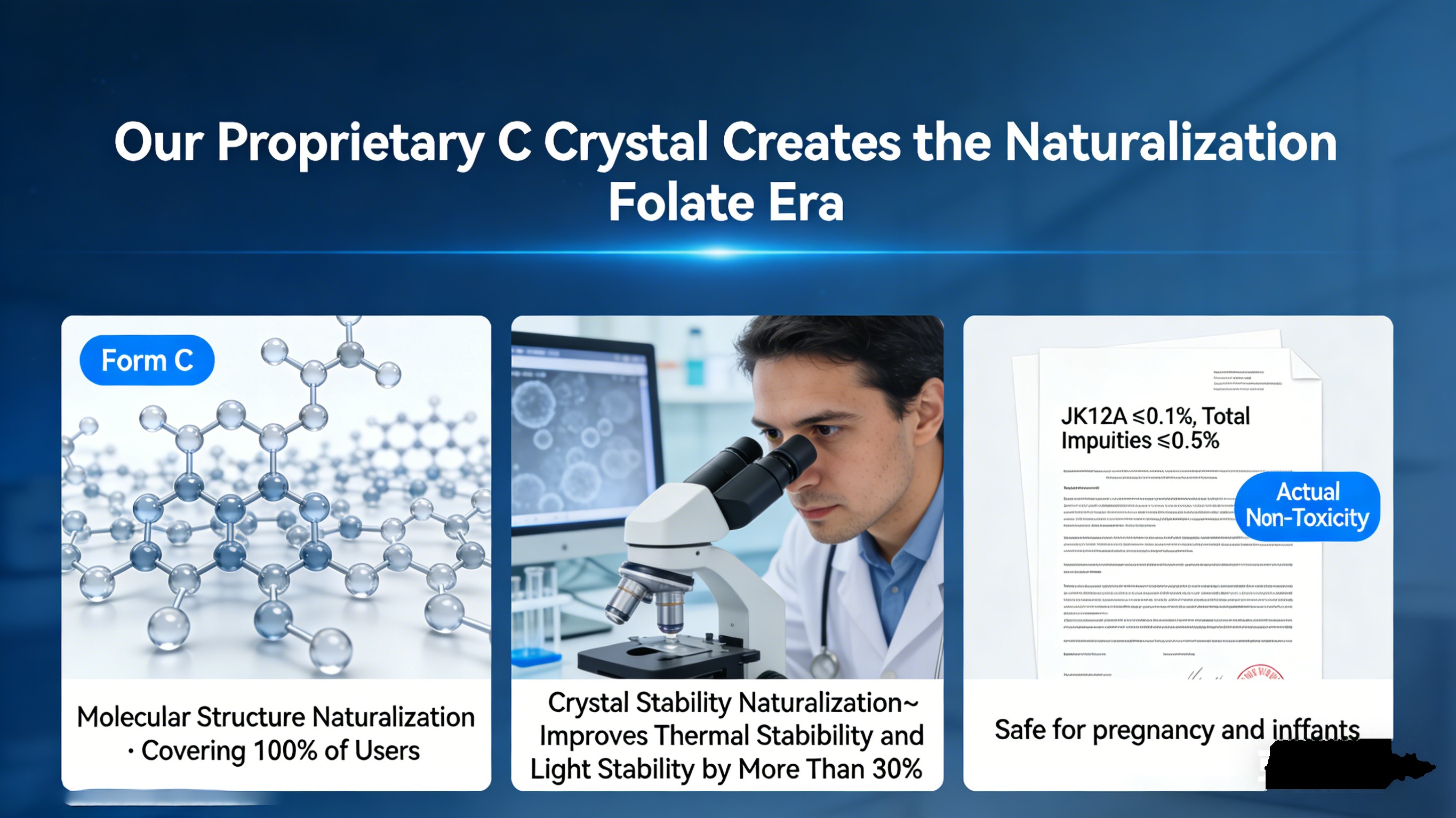 தனியுரிம சி-கிரிஸ்டல் இயற்கைமயமாக்கல் ஃபோலேட்: நமது உலகளாவிய காப்புரிமை செயலில் உள்ள ஃபோலேட்டின் படிக வடிவம் மற்றும் உலகின் முதல் இயற்கைமயமாக்கல் ஃபோலேட் வகை. பாதுகாப்பு உணவு-பெறப்பட்ட ஃபோலேட்டை அணுகுகிறது. இல் நிலையாக உள்ளது அறை வெப்பநிலை மற்றும் கர்ப்பம்-குழந்தை தரக் கட்டுப்பாடுகள் மிக அதிகமாக இருக்கும் உள்நாட்டு மற்றும் சர்வதேச மருந்தகங்கள். சமீபத்திய மேம்படுத்தலைக் குறிக்கிறது ஃபோலேட் தொழில்நுட்பம்.