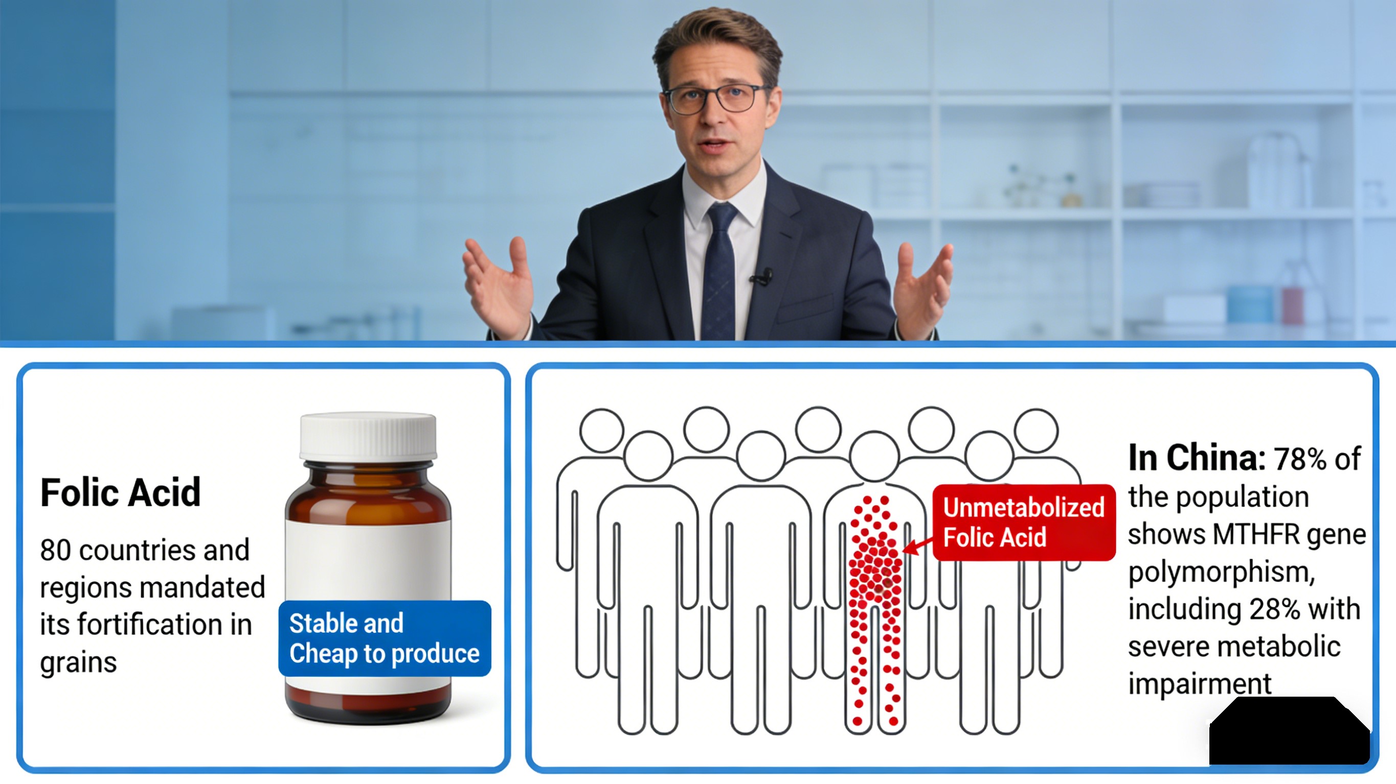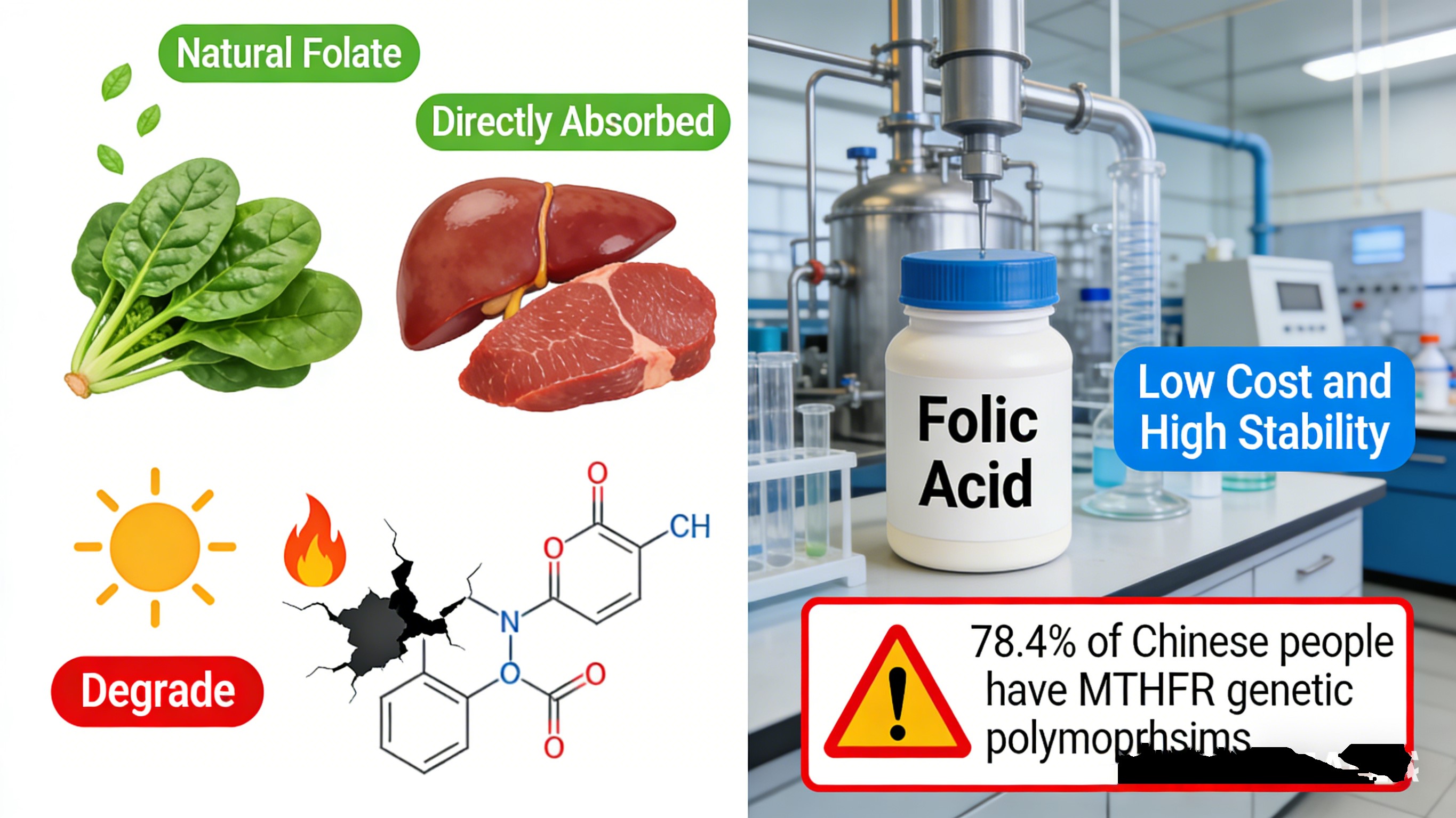 நடைமுறையில், கிட்டத்தட்ட 30% சீன மக்கள் ஃபோலிக் அமிலத்தை திறம்பட மாற்ற முடியாது, இது பயனற்ற கூடுதல் சேர்க்கைக்கு வழிவகுக்கிறது மற்றும் வளர்சிதை மாற்றப்படாத ஃபோலிக் அமிலத்தின் சாத்தியமான உருவாக்கம், இது வைட்டமின் பி 12 குறைபாட்டை மறைக்கக்கூடும் மற்றும் துத்தநாக உறிஞ்சுதலில் தலையிடுகிறது. நிறுவனங்களுக்கு, இது மொழிபெயர்க்கப்பட்டுள்ளது நுகர்வோர் புகார்கள் மற்றும் நற்பெயர் ஆபத்து.