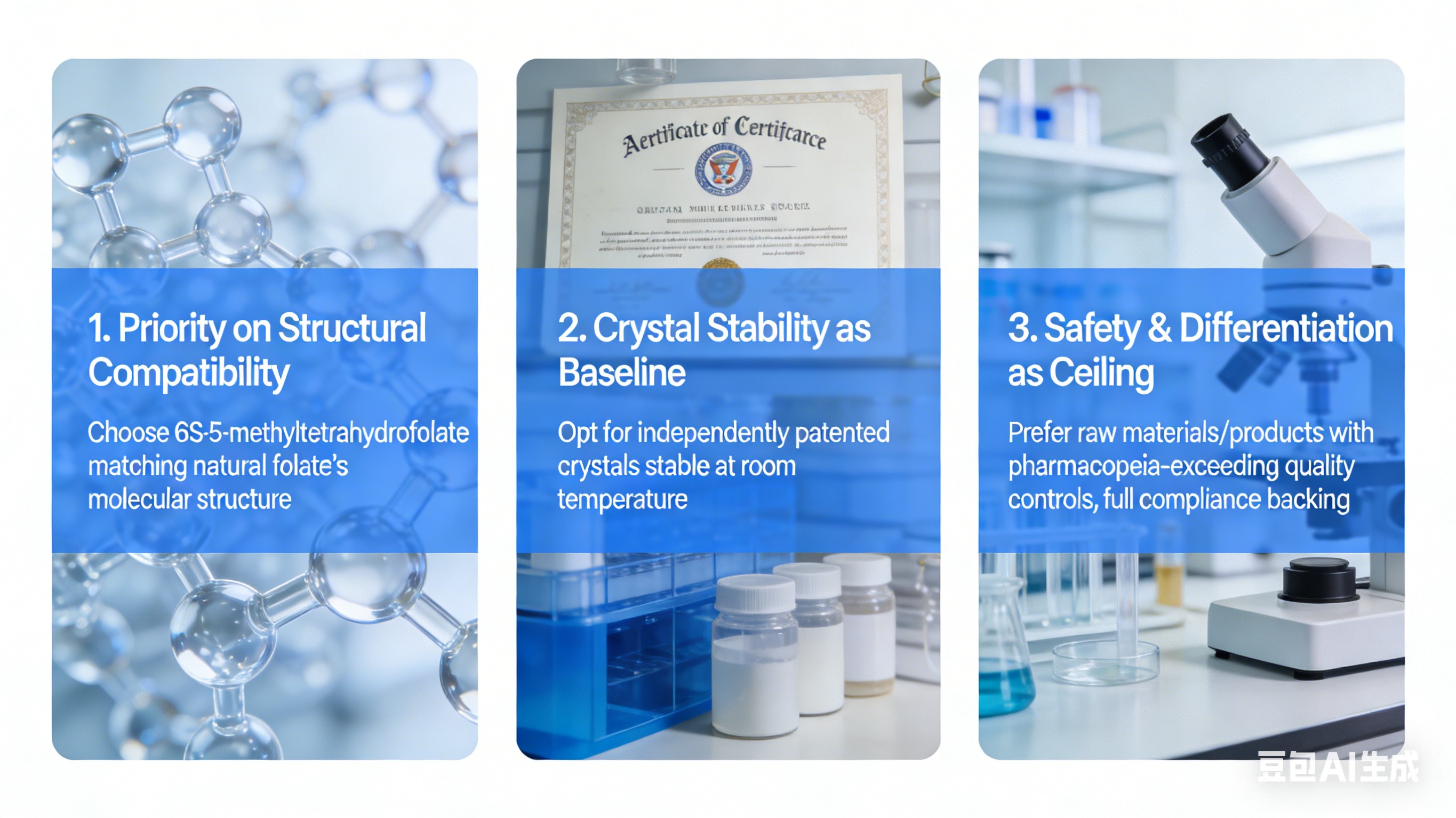 1. கட்டமைப்பு இணக்கத்தன்மைக்கு முன்னுரிமை: 6S-5-methyltetrahydrofolate பொருத்தத்தைத் தேர்வு செய்யவும் இயற்கை ஃபோலேட்டின் மூலக்கூறு அமைப்பு - நேரடி உறிஞ்சுதல், அனைத்தையும் உள்ளடக்கியது பயனர்கள், பயனற்ற தன்மையைத் தடுக்கிறது.2. அடிப்படை நிலையாக படிக நிலைப்பு: சுதந்திரமாக காப்புரிமை பெற்ற படிகங்கள் நிலையானவை அறை வெப்பநிலையில் தொகுதி நிலைத்தன்மை மற்றும் லேபிள் உரிமைகோரலை உறுதி செய்ய இணக்கம்.