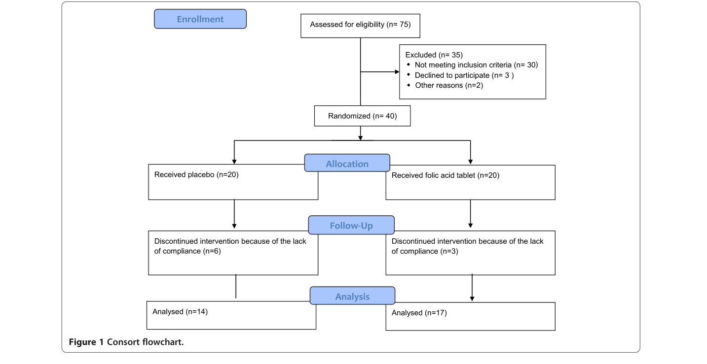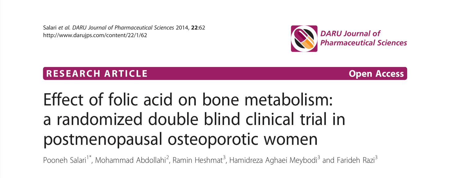 2014 ஆம் ஆண்டில், ஈரானிய ஆராய்ச்சிக் குழு, *DARU ஜர்னல் ஆஃப் ஃபார்மாசூட்டிகல் சயின்ஸில்* (அந்த நேரத்தில் IF 4.088) ஆஸ்டியோபோரோசிஸ் உள்ள மாதவிடாய் நின்ற பெண்களுக்கு ஃபோலிக் அமிலத்தின் விளைவுகளை ஆய்வு செய்யும் ஒரு சீரற்ற, இரட்டை குருட்டு சோதனையை வெளியிட்டது. நாற்பது பங்கேற்பாளர்கள் பதிவு செய்யப்பட்டனர்: ஃபோலிக் அமிலக் குழுவில் 17 பேர் மற்றும் மருந்துப்போலி குழுவில் 14 பேர் (சிலர் வெளியேறினர்). அவர்கள் 6 மாதங்கள் பின்பற்றப்பட்டனர்.